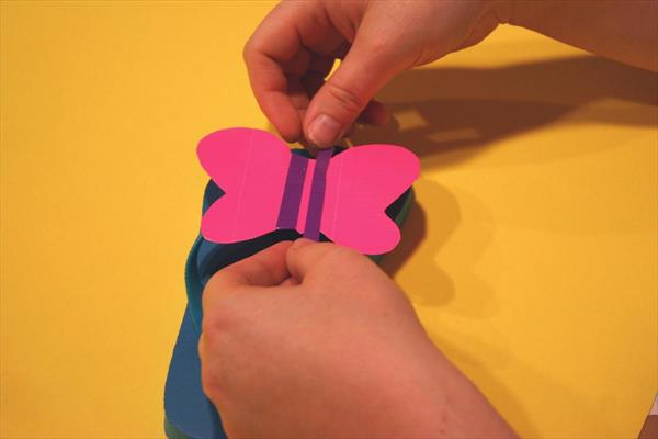 We have added three layers of duct tape to hold the butterfly tight on the slipper and the results made us happy a lot. Wings were looking to be missing some so we added 4 yellow dots on the wings by using a puncher and a yellow paper; this made the butterfly more handsome and fetching to be hold dear to all who are looking at it.