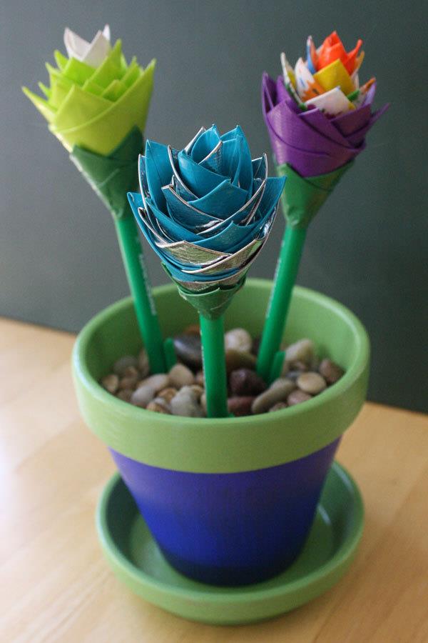 Any home desk and table can gloriously be ornamented through these home produced magnificent flower pens, charmingly held in a pot. The type of flower color can be changed by changing the duct tape color. The mural and mantelpieces in living room can be made brightened and alluring by these handcrafted gifts in the surrounding.